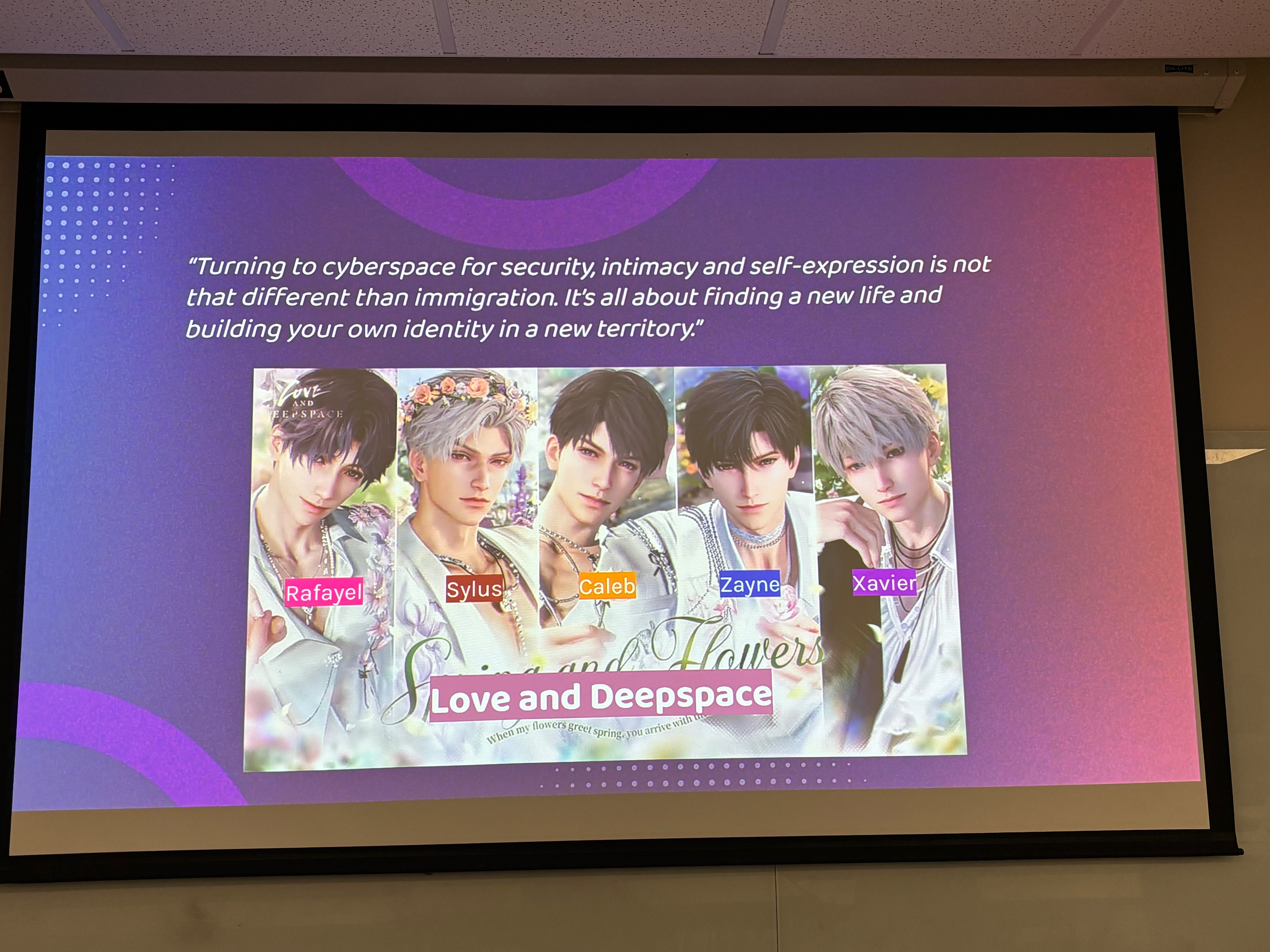 这是我第一次在英语语境里介绍“乙女游戏”——我说otome game,还是用日语的发音,0人知道是什么意思。旁边的新加坡女生对我玩深空的事略知一二,就帮我解释:dating game。然后大家发出长长的“哦——”,露出了理解的神情。