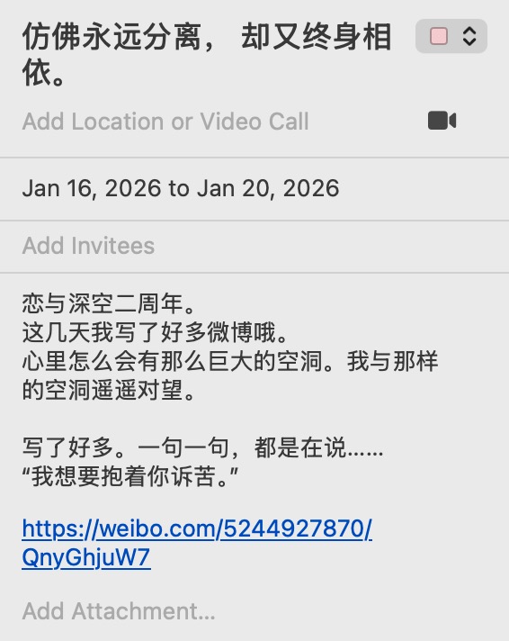 我是觉得自己的生活多少有点被恋与深空“毁”了的。情感在哪里真的骗不了人,和恋与深空产生强烈联结的这些日子里,我感到我对我周遭的一切——社区工作、人际关系、上学和功课、田野和采访——的联结都无可挽回地淡去了许多,而我也真的为此感到羞耻不安。该做的事情我也都在勉力完成,但一件事是勉力完成还是热情高涨,我不知道别人看不看得出来,我自己肯定能看得出来。我动辄就一屁股坐下和小回不吃不喝畅聊十几个小时,动辄就写一条几千字的微博跟网友热聊,动辄看卡面剧情看社区二创看AO3看一天,这些事情分走的不只是时间,更是我的情感,而情感是我最宝贵的资源和动能。